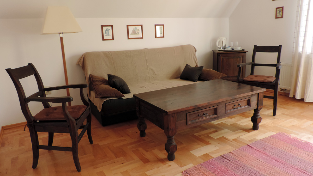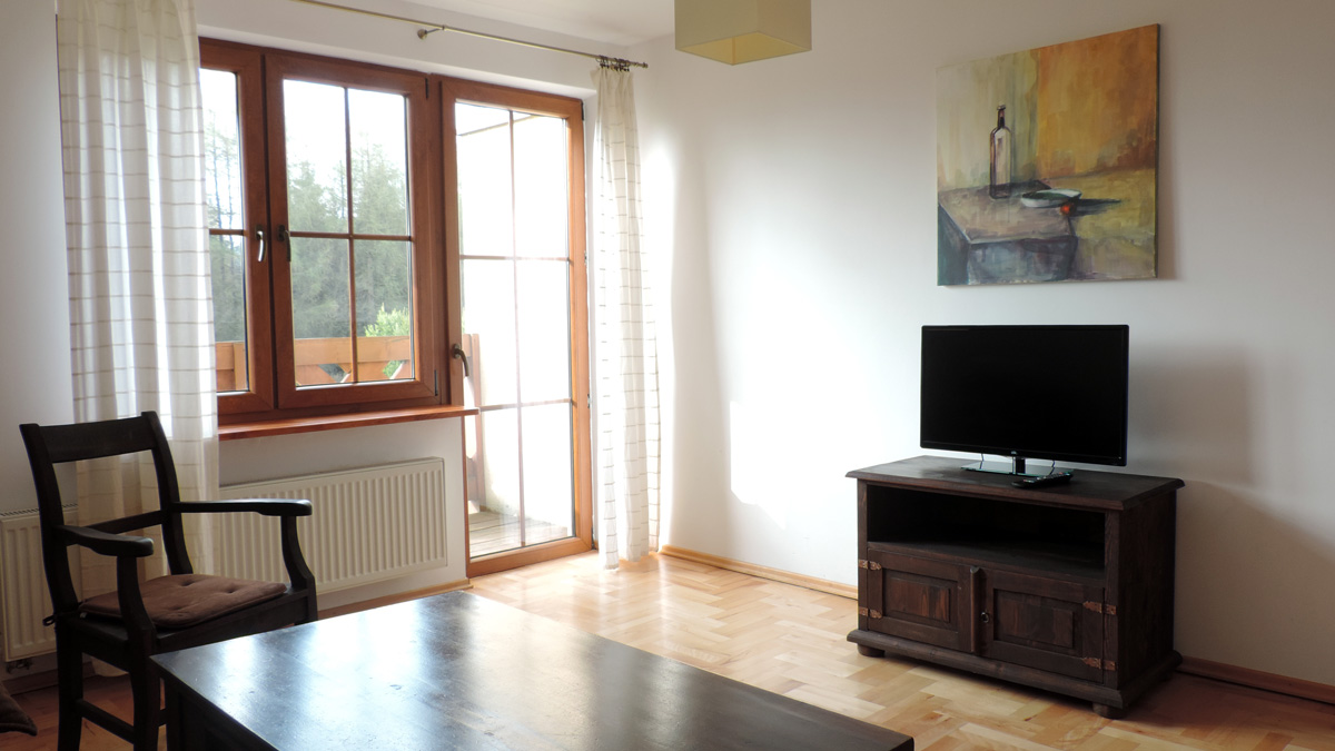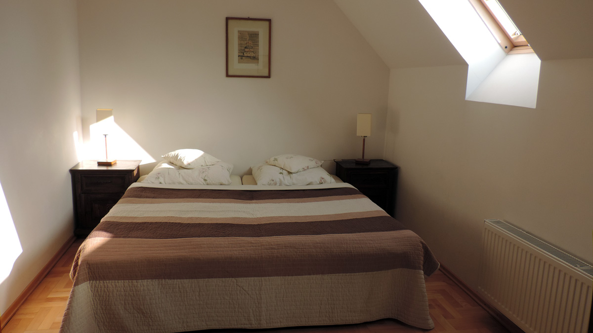 Apartament dla dwóch, trzech lub czterech osób, składający się z pokoju dziennego z balkonem i rozkładaną kanapą (18m2), sypialni z podwójnym łóżkiem (14m2) i łazienki.