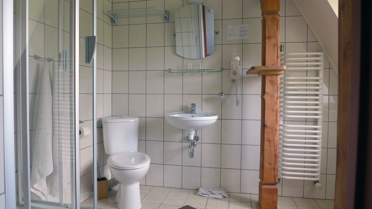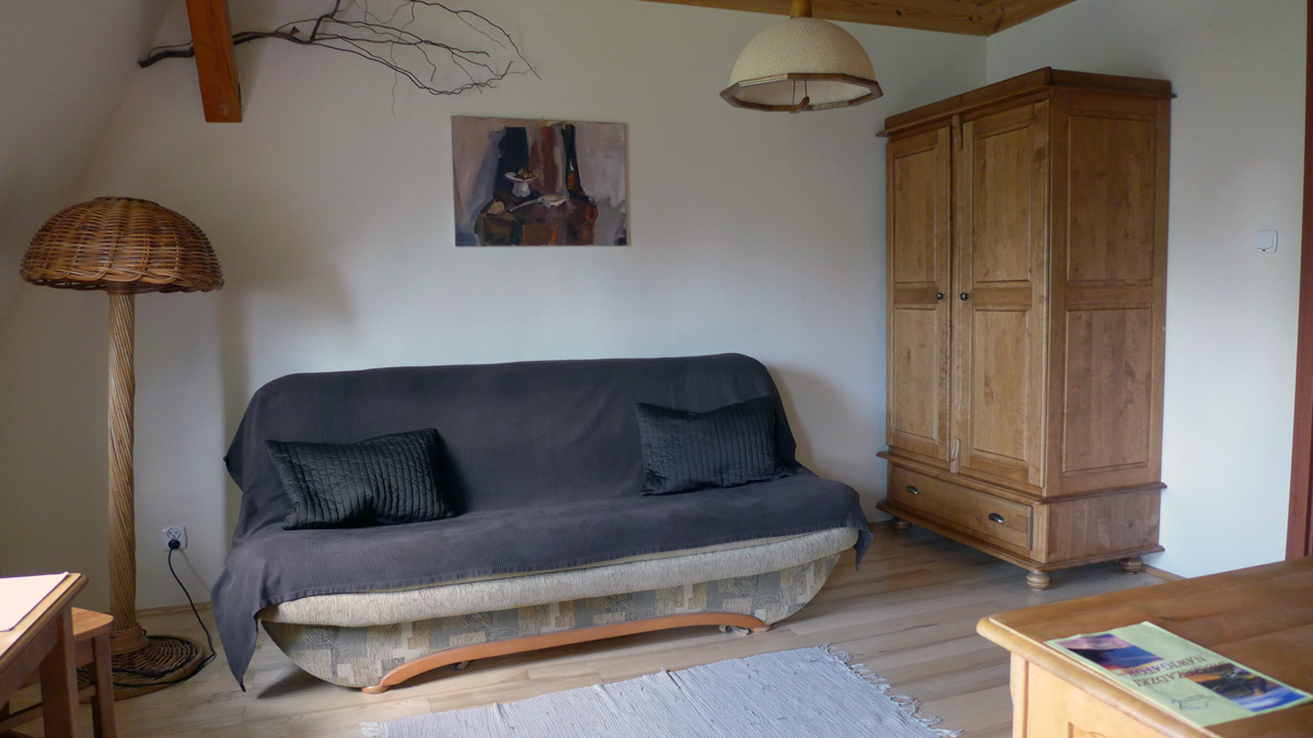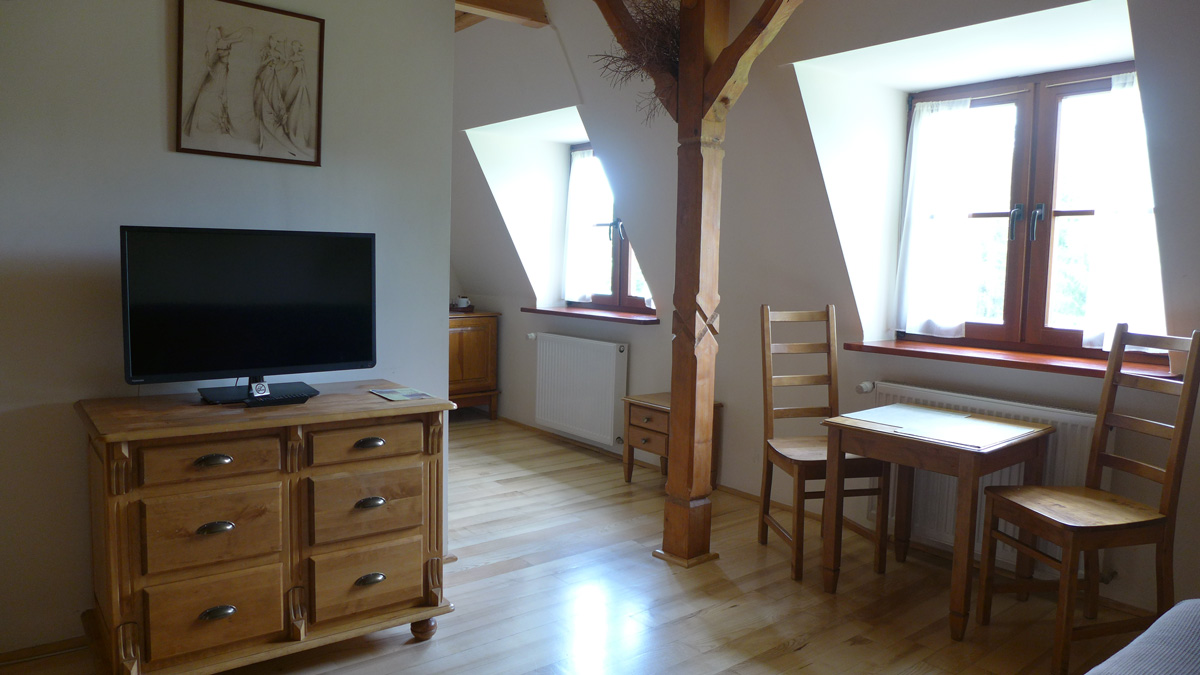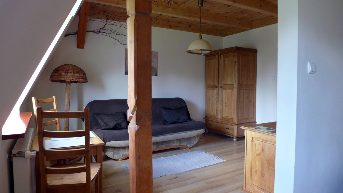 Apartament dla dwóch, trzech lub czterech osób, składający się z pokoju dziennego (13m2), z rozkładaną kanapą, aneksu sypialnego (11m2) z podwójnym łóżkiem i łazienki z oknem.